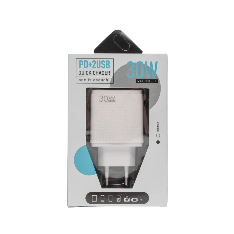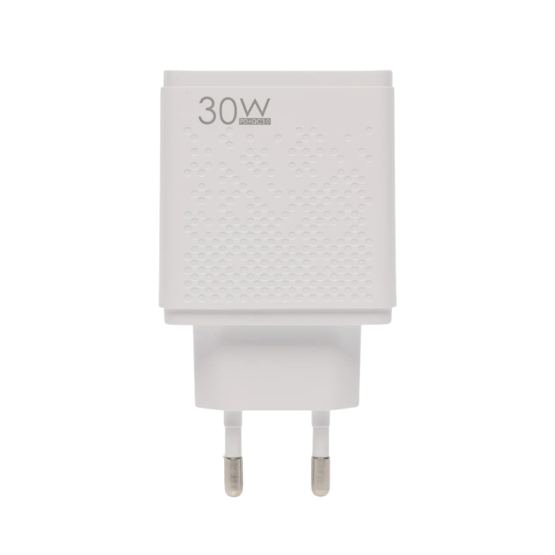 Este cargador rápido de 30W incorpora tecnología Power Delivery (PD) y Quick Charge, permitiendo una carga más eficiente y segura para celulares y tablets compatibles.